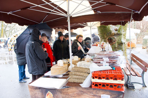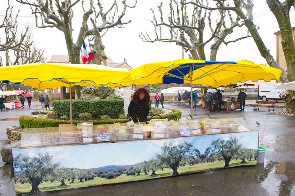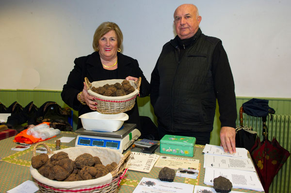 A truffle market, the third largest in France, is held in Aups every Thursday morning from the last Thursday of November to the last of February. (It is in January or February that the truffles are the best). This year, the rain had pushed the merchants to take refuge in the communal hall. The rabassiers, recognizable by their black chasubles and hats and their red scarf around the neck, present the truffles nestled in wicker baskets. The value of the truffle is set by the brokers, according the quality and the importance of the truffles offered for sale. A good truffle is that which is heavy, with a strong smelling, which is very black with white veins. A blow of knife can make it possible to check the flesh of the truffle. The truffle is to be consumed fresh, sliced or grated, and ennobles all the dishes, even the simplest, ravishing the papillae with its carnal perfume.