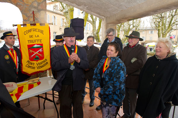 At a solemn ceremony of enthronement, in the presence of Antoine Faure, Mayor of Aups and Bernard Ugo, creator of the Truffle Festival, two personalities from the agricultural world were welcomed in the Confrérie de la Truffe du Mont Ventoux et du Comtat Venaissin, whose members were taking part to the hymn to the truffle in Aups. Very moved, Madeleine Goin, a farmer, beekeeper with 200 hives, and creator of a famous recipe of an incomparable black nougat, as well as Francis Gillet, President of the Trufficulteurs Varois, medalist of the Mérite Agricole, a generous man who works hard defending the trufficulteurs in the country of Aups, were dubbed.