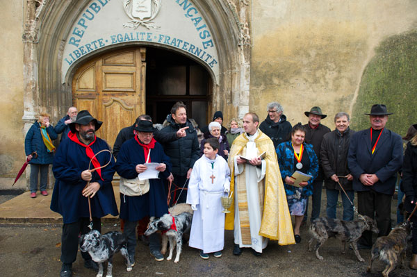 Bénédiction des chiens truffiers par le père Lucasz devant l’Église Saint Pancrace