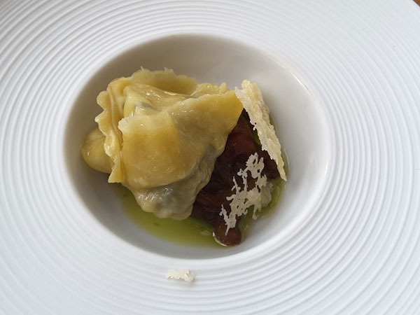 Cappelletis with Swiss Chard, confit Peppers, Pesto and Parmesan tile.