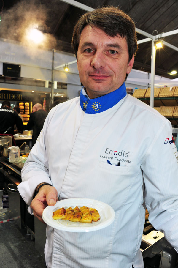 These cuisine crazy lovers, recognizable from afar with their black “toques”, fringed with orange and yellow flames, had made with the beautiful Metro products, some delicious recipes like Caramelized Pain Perdu with cream, Passion confit, Mango Leather and Vegetal Touch, made by Claire Verneil, a Crumble Confit Pineapple, Banana juice, Cardamone by Noëlle Cornu-Faure, a Pan-fried Foie Gras on a bed of Tomato, an Iberian Pork Chop with Parsley fondue and Sherry Vinegar and a Flambéed Pineapple with Balsamic Vinegar by Florent Houget, a Pineapple à la plancha, Caramel and Olive Oil (Laurent Capdeville), a Curry of Sweet Potato with Wild Seabass steak with young grilled Vegetables by Redouane Mansouri.
