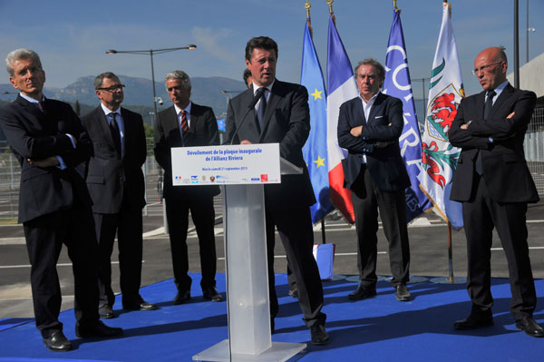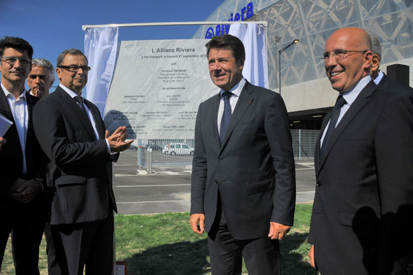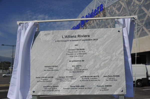 On September 21, 2013, on the eve the inauguration of the Allianz Riviera stadium, the Metropolitan Nice Côte d’ Azur, the city of Nice and its partners unveiled the inaugural plaque on Boulevard des Jardinniers. The ceremony took place in the presence of Christian Estrosi, Deputy Mayor of Nice, Eric Ciotti, MP and President of the General Council of the Alpes Maritimes, Adolphe Colrat, Prefect of the Alpes Maritimes, Xavier Lortat-Jacob, President of Nice Eco Stadium, Jacques Richer, CEO of Allianz France and Jean- Michel Wilmotte, Architect.
