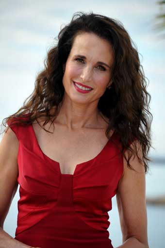 Andie MacDowell radiated the very evening in a beautiful gray satin dress on the arm of her partner Dylan Neal on the MIPCOM 20013 Opening Party Red Carpet.