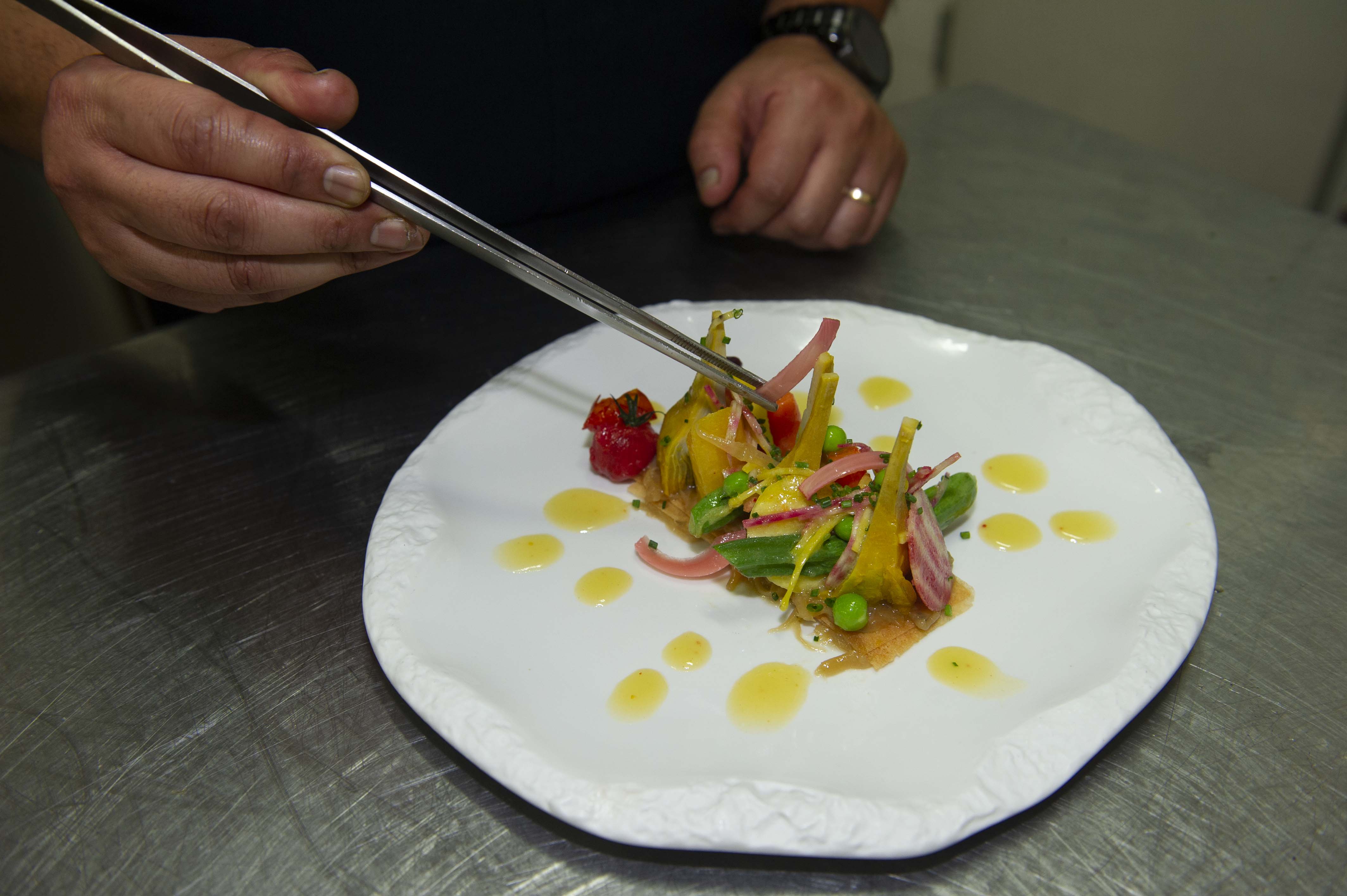 Tartelette Craquante en Feuille de Brik, Confit d’Oignons, Artichaut Poivrade cuit et légumes du soleil crus, vinaigrette de citron, miel et moutarde.©YesICannes.com