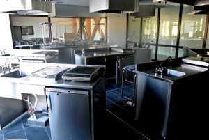 The designers of this key equipment in Villeneuve-Loubet favored the use of wood, omnipresent noble and ecological material: floor, walls and acoustic panels in the theater and ceiling and interior wall decoration in the hall and the library. Natural light also plays an important role, led by an atrium. The visit began with the future Mediathèque accessible to residents of the CASA (Urban Community of Sophia-Antipolis), the space for cooking classes with 6 adjustable cooking stands, adjoining a room where participants can follow the development recipes on screens.