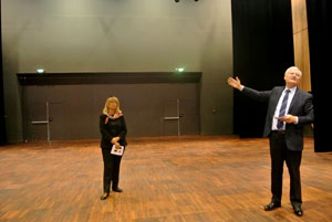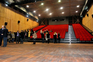 The Mayor presented the beautiful brand-new auditorium, fully equipped with cutting-edge technology, also covered with good-smelling wood, whose bleachers are filled with red armchairs. This theater has a capacity of 450 seats, and bleachers are retractable, enabling to leave room for a space that can be resituated with each act, and the 170 sqm stage has an opening at the back to the outside for open-air shows.
