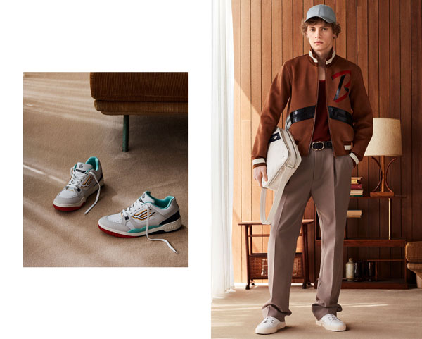 Inspired as much by Jack Kerouac as Gunter Sachs and Napoleon Dynamite outlooks, the Bally Man boats an optimistic and eager youthful mindset. Unencumbered by deadlines, he is along for the ride, exploring a new chapter, wearing sneakers, including the Champion model Bally (model from the 90s). Iconic details, such as the Super Smash logo, add a subtle touch to the bags and accessories while layering layers help create a fluid silhouette structured by 70s jackets. Sneakers are central, but the Bally man also desires a structured woven leather loafer and mixed material boot styles and high-top espadrille with a crepe-sole. His backpacks combine practicality with luxury in a variety of shapes. A fluid silhouette is realised through layering. Trenches overlay paper thin leather jackets and shorts. 70’s-style blousons and suede bombers provide structure over loose, belted trousers.