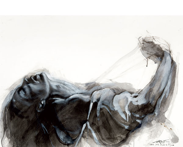 Playing with black and white to breathe life into the rigorous lines and delicate chiaroscuro, Franta, who excels in ink and wash work, has a similarly powerful, blunt impact: he shares with us intense, shimmering blacks that make darkness a vehicle for light and inhabit his characters.