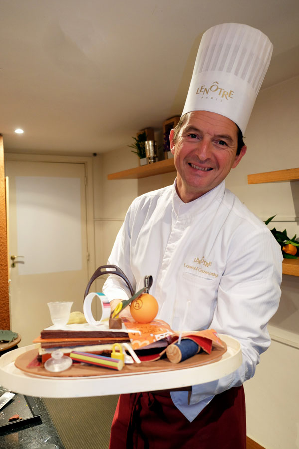 The creators of Hermes luxury goods – clothes, leather goods, bags, belts, accessories and the famous “Carrés” – have reinterpreted in sweets the raw materials and tools used by the workshop small h. The Bûche Lenôtre is decorated with a Saint-Louis crystal in cast sugar, a chocolate “Carré” true to the drawing on silk “Les Confessions” by artist Flavia Zorrilla Dagro. There is also the iconic stirrup and locks of chocolate. The tools of the artisans are evoked in sweet flavors like the nail “Medor”, the wire coil and beeswax in marzipan.