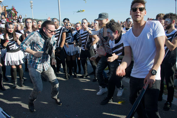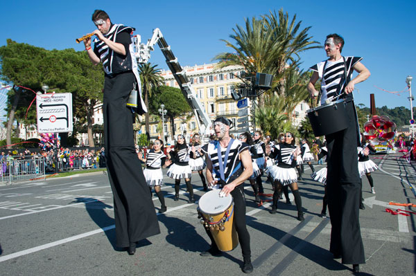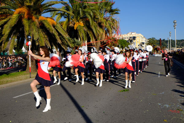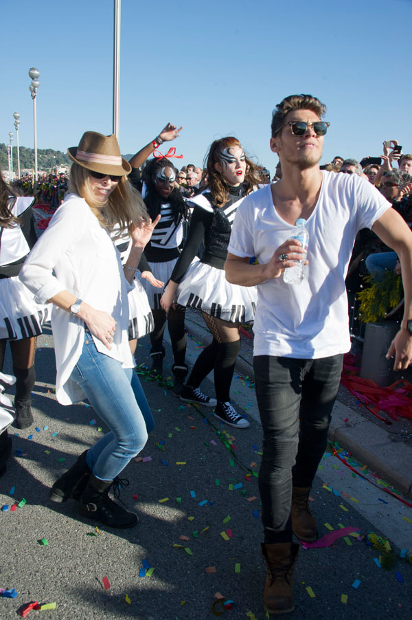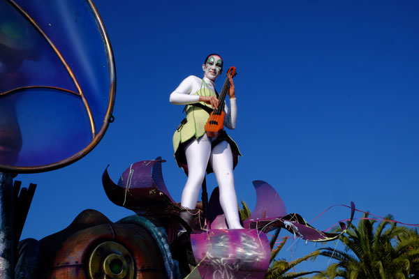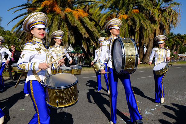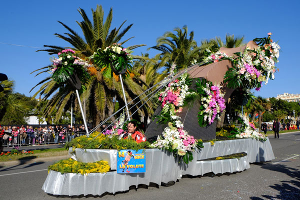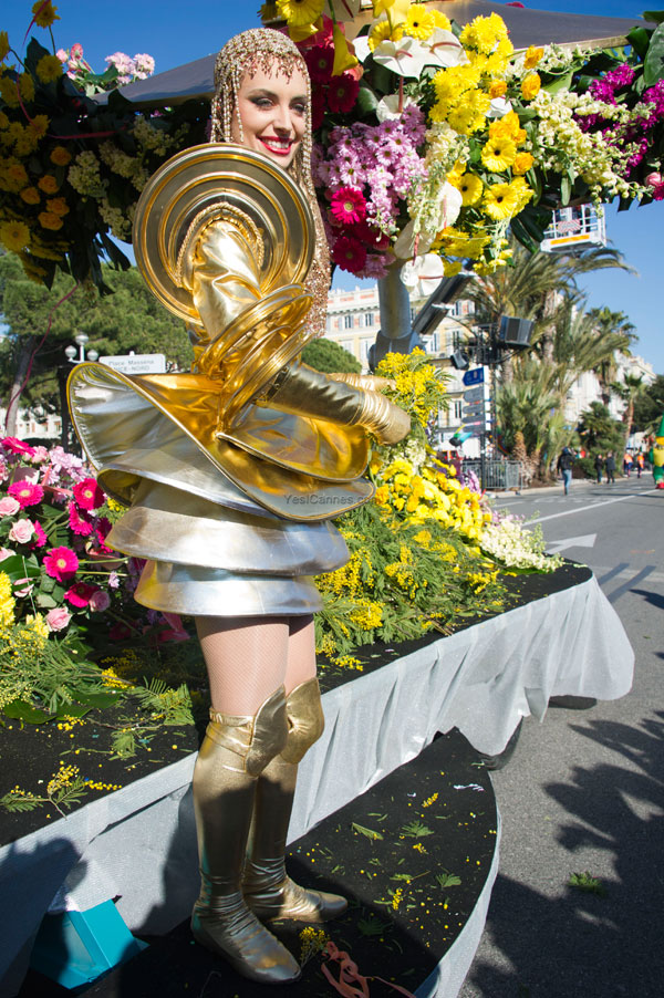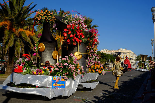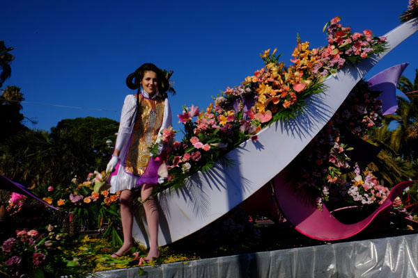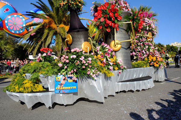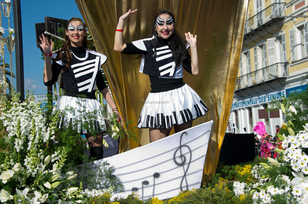 This year, the floats, larger and more complex, were new, redesigned on the theme of Music. On each float, beautiful young models dressed in gorgeous costume, launched some 100,000 flowers to the public gathered on the Promenade des Anglais.