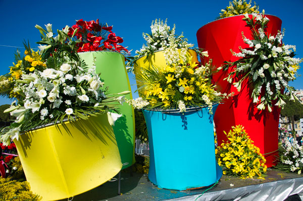 A floral float is measuring approximately 6 m high, 7 m long, 2 m wide. The decoration is made by hand, with thousands of flowers, laid one by one, into the night and the morning preceding each “battle”. This event promotes the French Riviera quality and great floral variety, since 80% of the flowers come from local producers.
