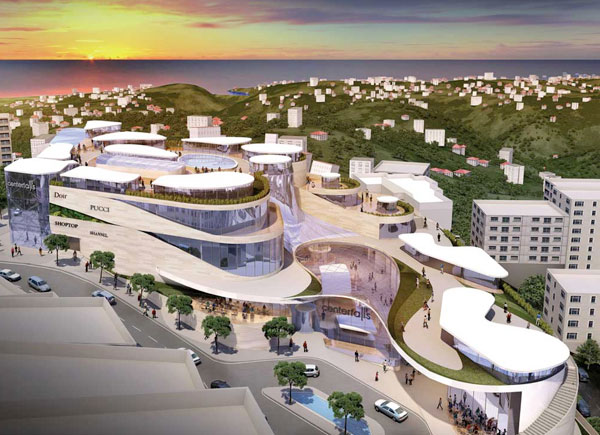 The effect will drammaticaly be emphasized with a vertically open and transparent layout that will allow the surrounding nature to enter the building. A gigantic waterfall originating from underneath the roof terrace will falls down across 5 levels into the heart of the development to the luxury area, creating the largest waterfall ever built in a shopping destination.
