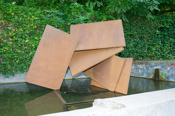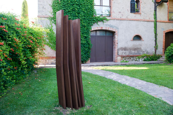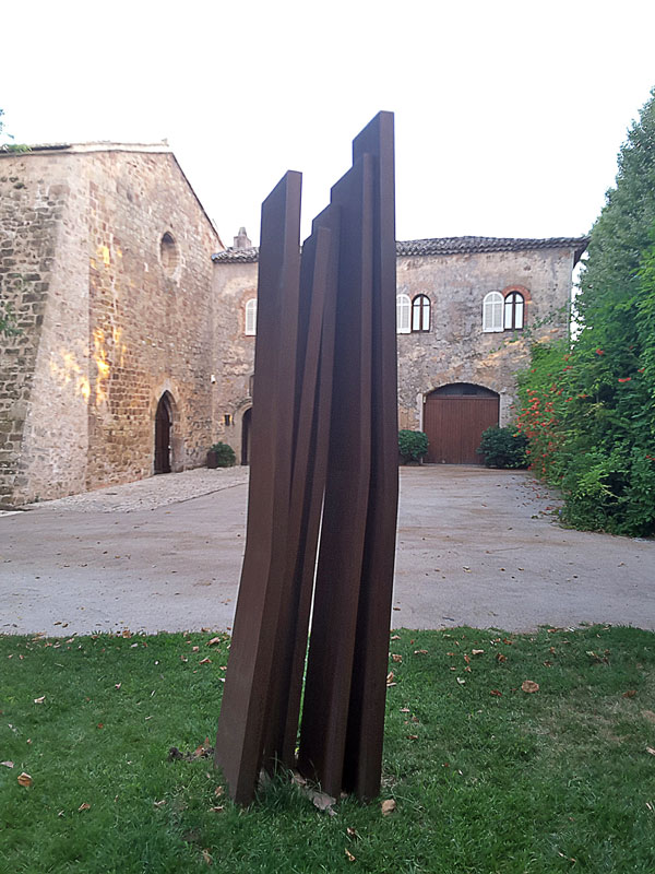 The exhibition at Château Sainte Roseline is made up of six abstract works in steel in the image of plants inhabiting the nature of the park, against the vineyards of the estate. The monumental pieces of steel are named: 6 Lames horizontales, Carte en Noir, 4 Lames verticales, Ayin, 6 lames verticales, Carte, Croisée, Végétal, Oblique, Tempora and Ombre.