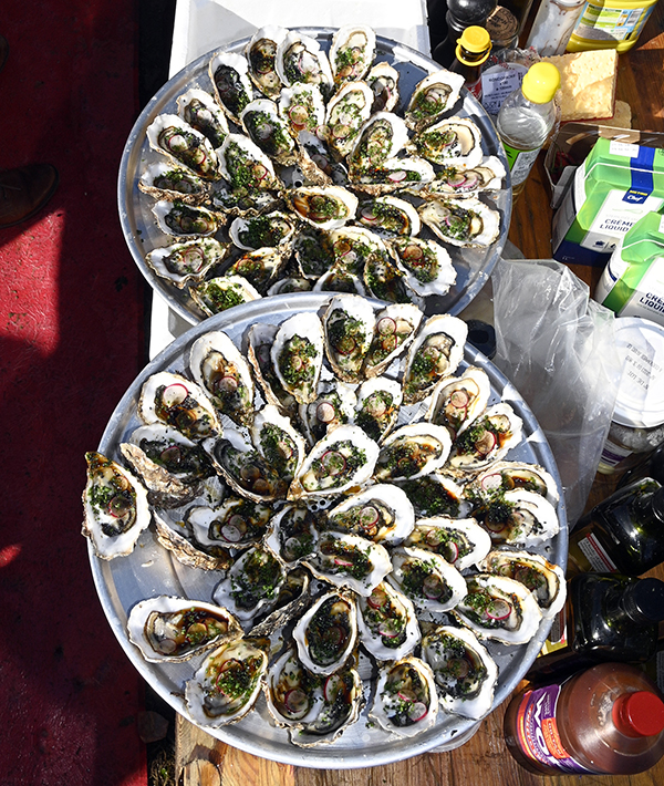 At another barbecue station, we were cooking tandoori marinated chicken with garlic and olive oil, and marinated ribs. Noëlle Faure prepared a country-style soup with onions in a cauldron, while David Faure roasted a whole sheep. Elsewhere, salmon fillets marinated in citrus fruit and cooked on the skin were sizzling, as were barbecued oysters topped with a virgin sauce made with herbs and rice vinegar… Enough to keep you crowded in front of the buffets rather than heading off down the slopes!