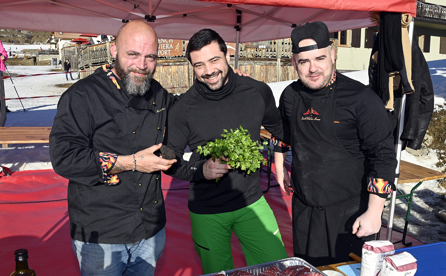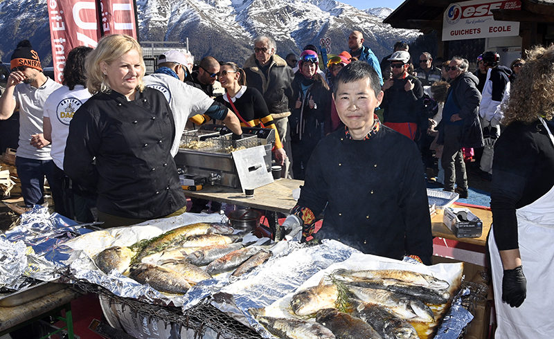 In glorious sunshine, the Toques Brûlées’ locavore, lovingly cooked by the cheerful and spectacular brigade and guest chefs, including the Toques Blanches, delighted visitors and their families. Each chef offered his or her own refined recipe, prepared at the foot of the snow front and slopes, under the watchful eyes of Colette Fabron, mayor, and Michel Guillot, President of the Auron Tourist Office, organiser of the Festival.