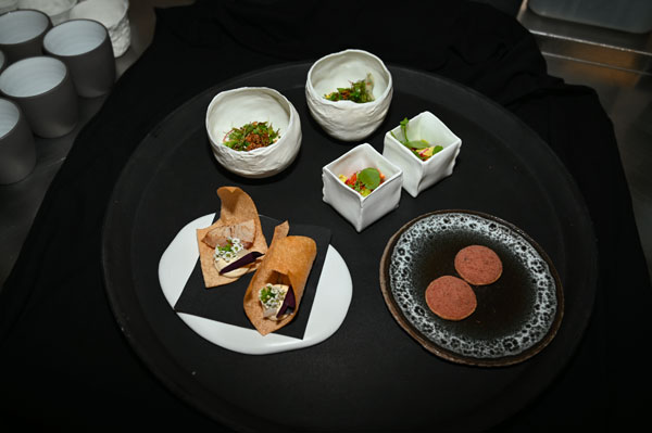 Amuse-bouche – Le Terroir Maralpin: Iodine and spices. Rice chips with sherry vinegar accompanied by a lisette (young mackerel), marinated in a fermented soy sauce. In the white pot: trout in a paprika crumble, celery sauce and sake. A game of textures on a base of potato, dried sardine and quinoa. Coriander, garlic and walnut shortbread, with, on top, dried beef from Entrevaux.