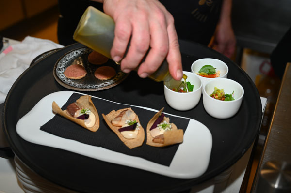 The warm evening opened with, as an aperitif, the invigorating notes of the tasty Riounet, the cocktail of the talented and endearing Victor Delpierre, World Barista/Cocktail Champion, who imagined the beverage – which has become the official drink of the resort – during the Chefs au Sommet d’Auron 2018. This harmonious nectar of the summits can be sipped cold after a beautiful summer walk in the mountains, or enjoyed as a toddy or mulled wine after a day on the snowy slopes, or after skiing to comfort yourself. Supplemented at 50% with a bubble, Champagne, Crémant or Prosecco, the cocktail becomes a great aperitif to accompany the most beautiful festive moments.