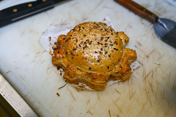 Entre Deux Vallées: Cereals and Foie Gras: Pie made with duck, foie gras and pig, small reduction of meat juice, sucrine with a sherry vinaigrette and pumpkin flower dressing.