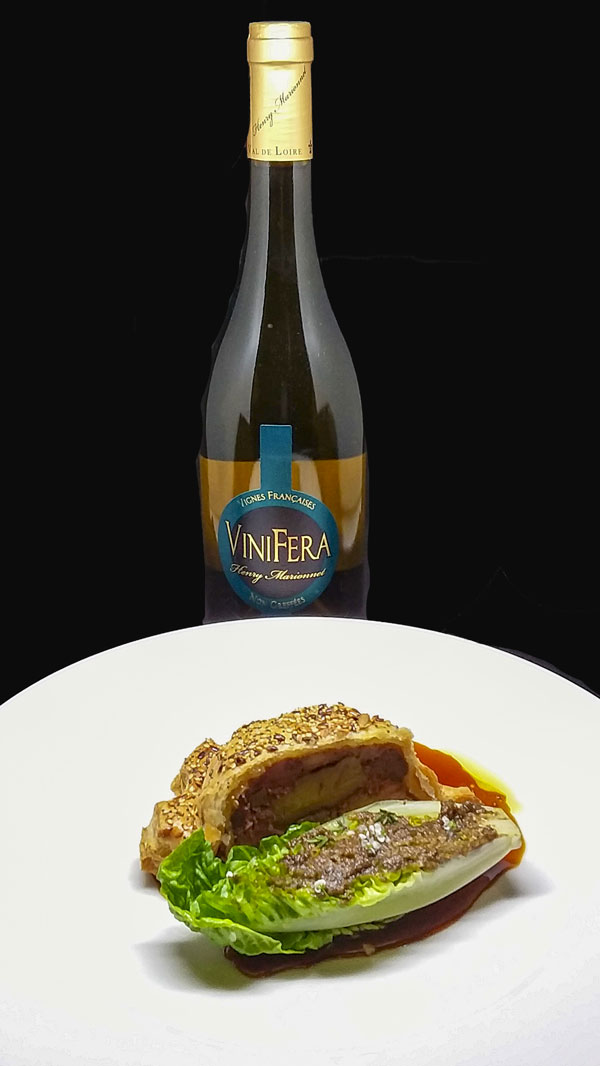 La Rencontre de Deux Territoires: Ravioles stuffed with Piedmontese fond vines, beef cheek, beef pastrami and Saumur aubergine consommé.