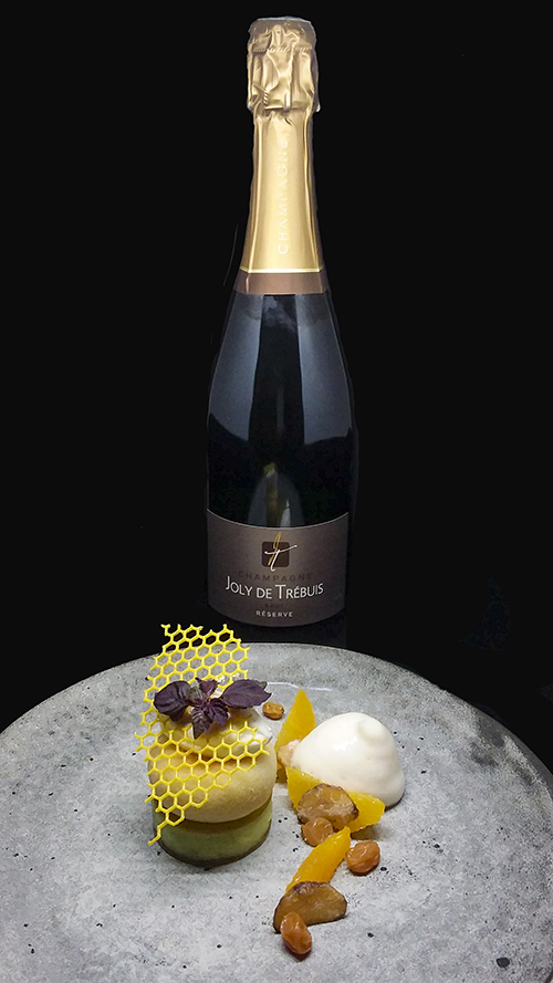 Savarin with Azé gold, chestnut slivers, golden raisins with amber rum, iced note with coriander