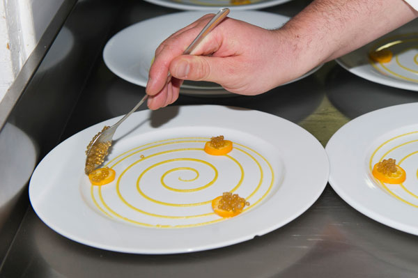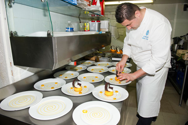 Dessert: Kumquat with Lavender Honey, Craquant of Dark Chocolate 70%. This citrus fruit with a sparkling orange color, from far horizon, brings a zest of vitaminized and perfumed freshness. Covered with an appetizing orange frosting, the heart opens on a light dome-shaped mousse, delicately placed on a melting pâte sabléee. The honey with the sweet scent of lavender is a nice nod to Provence and our taste buds deliciously excited by the voluptuousness of the dark chocolate bow crowning the whole, remind us with every mouthful some happy memories from our childhood.