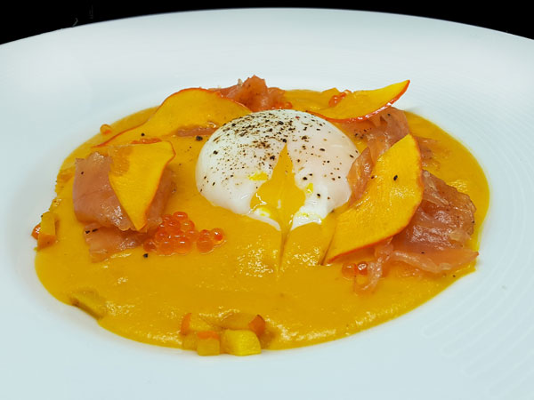 Starter: Potimarron Velvet, Organic Egg, Smoked and Gravlax of Mercantour Trout. With mouth-watering colors, the elegant and refined sweetness of pumpkin blends with that of organic egg, and contrasts with the fine, strong flavor of the smoked trout.
