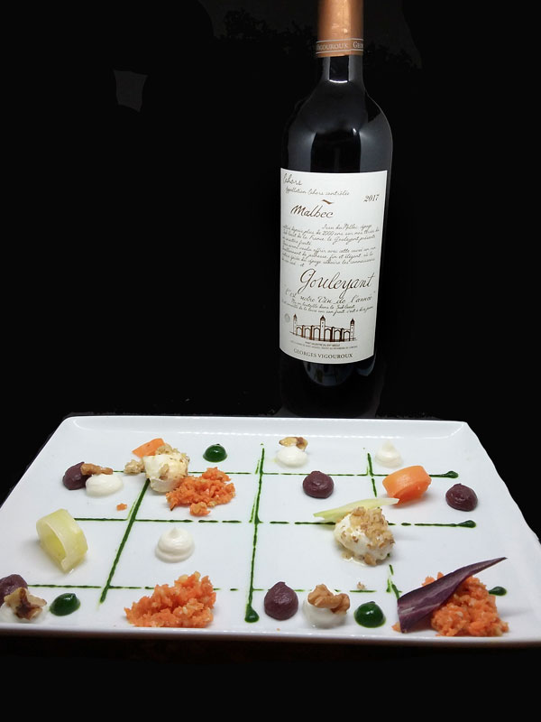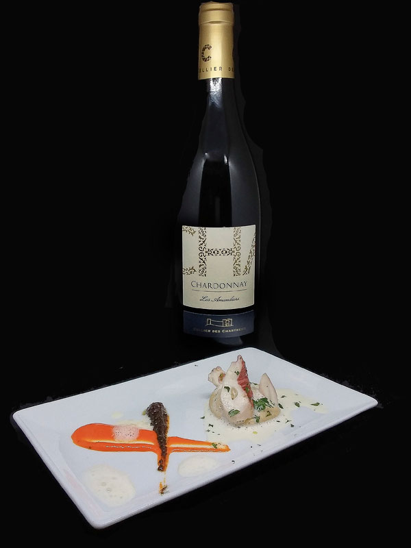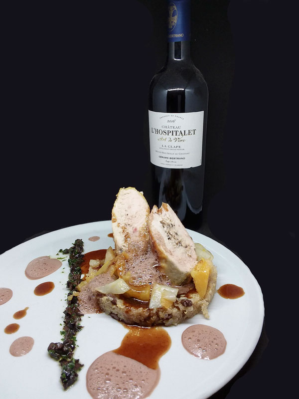 Plat: Supreme of Guinea Fowl stuffed with Olives and candied Lemon, Quinoa with Raisins and glazed forgotten Vegetables and Hot Wine Cappuccino. A light meat perfectly cooked, with nice seasonings, on a slab of fondant quinoa. A very successful digest of the Provençal winter terroir enhanced by the fresh and sunny scent of olive and lemon.