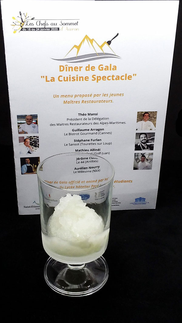 In the presence of Colette Fabron, Mayor of Auron, and the couple who sponsored the culinary event, Noëlle and David Faure, the five exceptional chefs delighted the palate of gourmets by composing a menu of creative masterpieces, with local flavours, combining simplicity and modernity in finely composed dishes: Guillaume Arragon (Le Bistrot Gourmand – Cannes), Stéphane Furlan (Le Sansot – Tourrettes sur Loup), Mathieu Allinéi (Le Bistrot du Port – Golfe Juan), Jérôme Clavel (Le 44 – Antibes), Aurélien Nourry (Le Millésime – Nice).