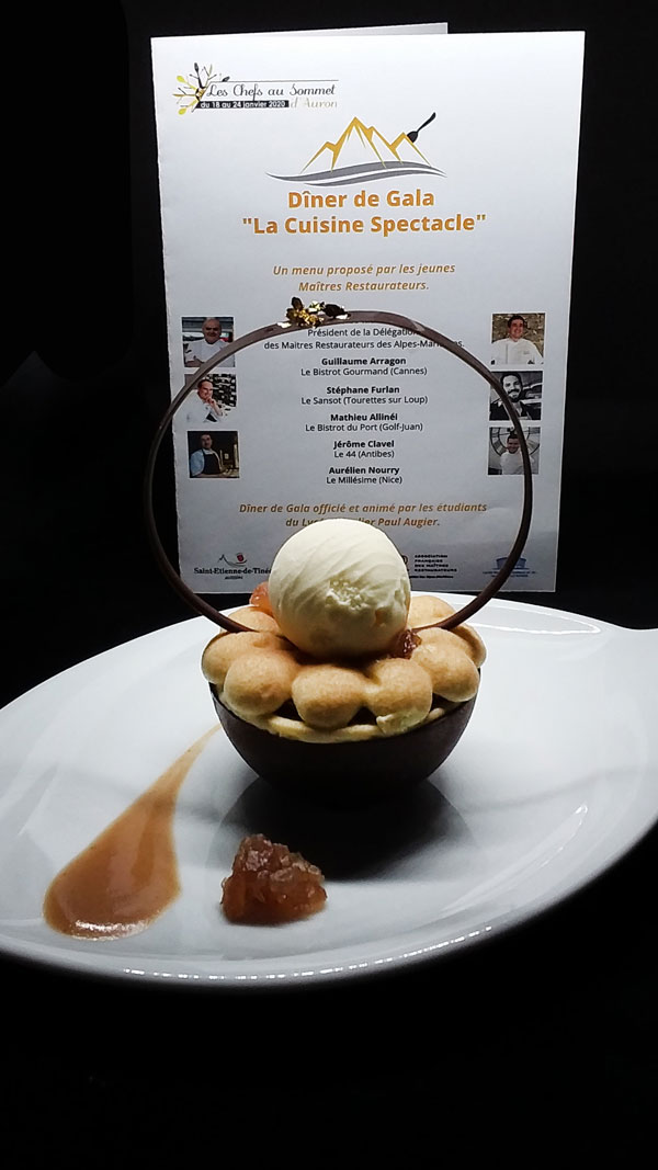 This year, Michel Guillot, President of the Tourist Office of the Tinée Resorts and organizer of Les Chefs au Sommet d’Auron, brought together five young Maîtres Restaurateurs from the Alpes Maritimes, represented by Théo Mansi, their President. After delighting the public’s taste buds at the inauguration of Les Chefs au Sommet d’Auron on the central square, the Maîtres Restaurateurs orchestrated a sumptuous gala dinner for 100 guests at the Salle Rovery. The Maîtres Restaurateurs’ recipes were prepared and served with brio by the students from the Lycée Paul Augier, as part of an educational project.