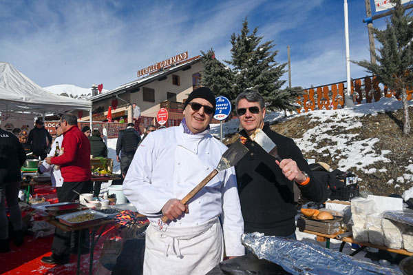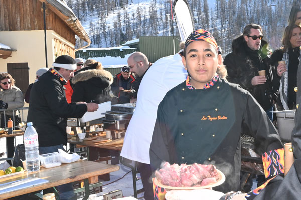 Under the flamboyant Toques Brûlées outfit, cheerfully hosted by the godfather of the 2020 edition, chef David Faure from SensÔriel in Nice, and Noëlle, his accomplice in the city as well as in the kitchen, Les Chefs au Sommet d’Auron offered more than three hours of gourmet happiness to skiers and skaters, inhabitants of Auron and tourists, by hosting with their giant barbecues a Culinary Art show of rare intensity.