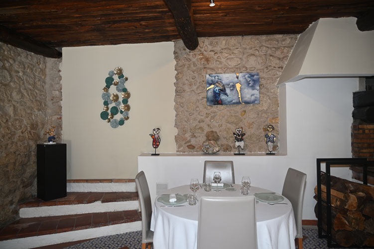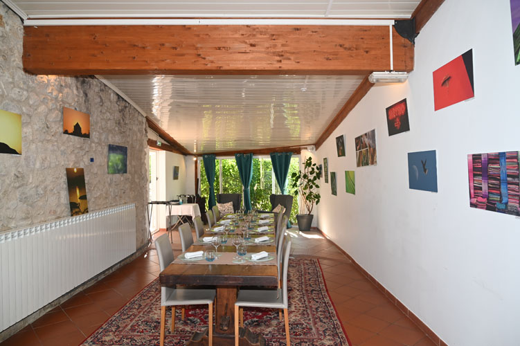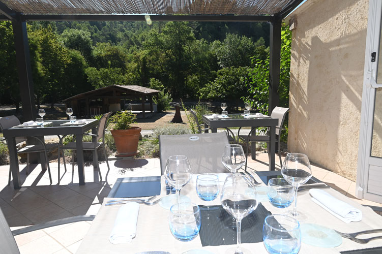 Bordered by the Artuby, a river flowing down from the nearby mountains, the Clos Pierrepont is a former post-house that has naturally become a vast hotel-restaurant that Magali and Julien Lépine have completely renovated by embellishing the dining room, creating a magnificent terrace and a beautiful garden of aromatic plants and lavender. The old stones in soft ochre tones bear witness to a rich past of hospitality where the brown exposed beams and the large fireplace in the dining room with its tablecloth tables give their tokens of tradition, authenticity, conviviality and comfort in the cold weather. In a room close to the stoves, a huge solid wood farmhouse table can accommodate large numbers of guests. The walls are decorated with superb colourful paintings and sculptures where water plays a dominant role. Furnished with metal and glass tables and light chairs, in the company of large barrels, the shaded terrace opens onto a vast park where children can romp about in complete safety.