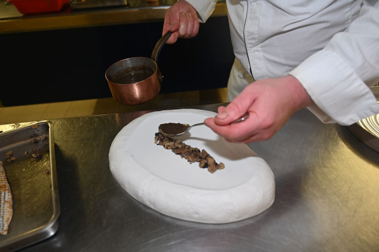 Mise en bouche: Small choux with rillettes, sardine, a touch of cumin and purslane; Valrhona chocolate, smoked herring, Jerusalem artichokes and herring caviar; Emulsion with black garlic, calf’s head, mushrooms in vinegar and roasted hazelnut.