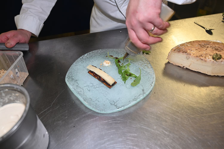 The refined goat and ewe Tome de la Pastourelle in Chateaudouble, hazelnut shortbread, candied Alsatian quetsches, iced milk with goat flower Tome.