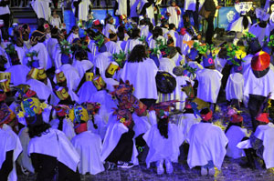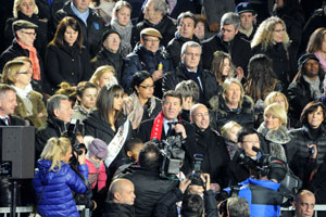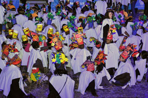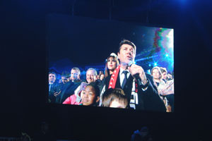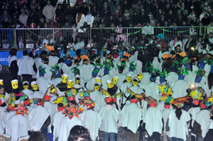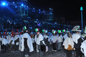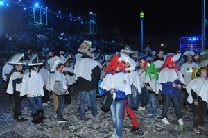 1250 school children of the Metropolis, divided into 5 groups to represent the five continents, then began singing and make choreographies. The children wore colorful Asian, African headdresses and even a pizza packaging!