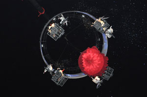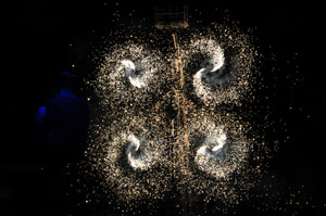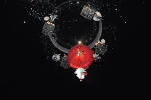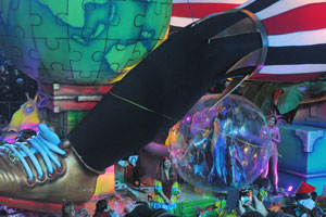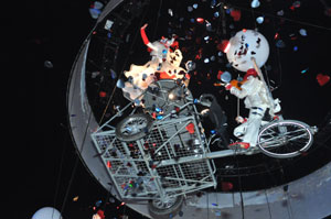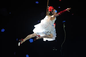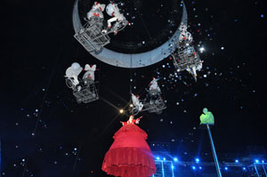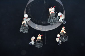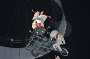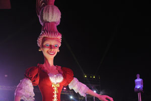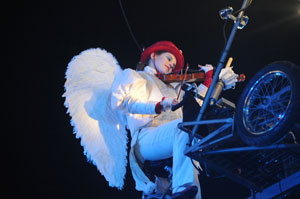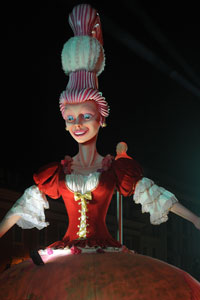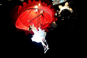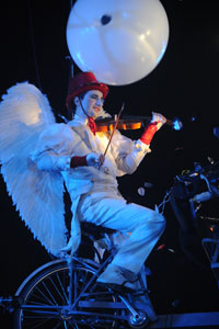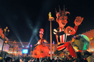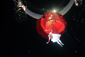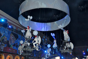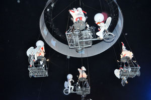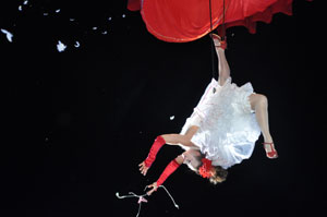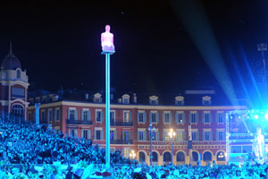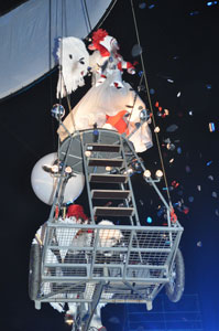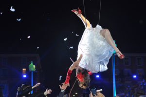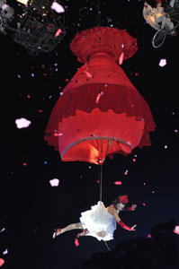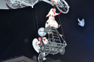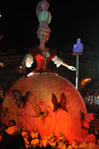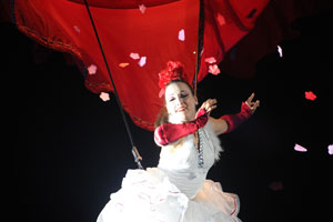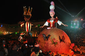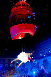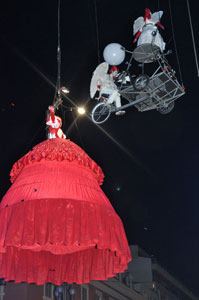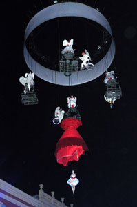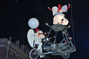 The opening festivities of the 2013 Carnaval of Nice began with the incredible aerial ballet by Belgian theater Company TOL, which had chosen the sky as stage. The show Heart of Angels in Paradise featured four angels hitch playing fiddlers and sowing hearts, hanging above the Place Masséna on a carousel, to which was added a diva in red dress, concealing an acrobat who performed acrobatic dance, suspended by a string. A stunningly beautiful and poetic show, courageous and creative.