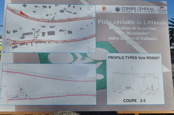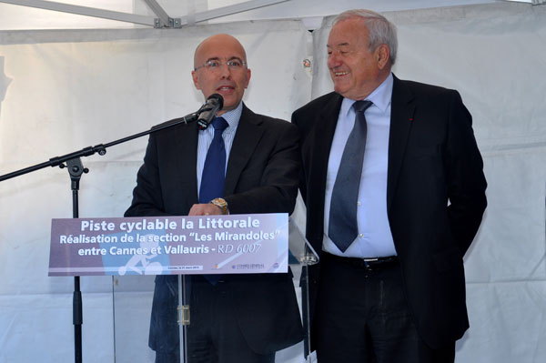Eric Ciotti, President of the General Council of the Alpes Maritimes, had made the trip to the inauguration. He recalled in his speech that this project, aiming the construction of a 74 km autonomous bike path between Théoule and Menton, via the main coastal roads, was to improve the urban environment in the department. He thanked Mayor of Cannes Bernard Brochand and First Deputy Mayor of Vallauris, Guy Giraud, presents at the inauguration, of having privileged an ongoing development rather than interrupted sections, as favorited by the General Council. The General Council, partner of the operation, aims to materialize by 2015 a traffic corridor along the Alpes-Maritimes seafront: the Littoral is part of a larger European project that would allow to ride through countries of the Mediterranean arc from Spain to Greece. This bike lane already exists from Nice to Golfe-Juan.