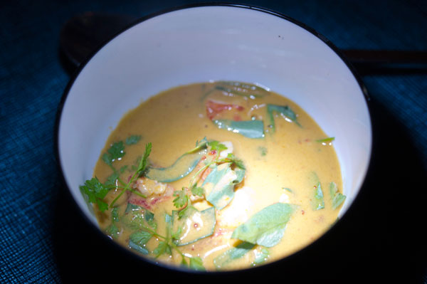 The amuse-bouche is served as the cable begins its climb to the peaks: a Lobster Bisque flavored with coriander and tarragon with delicious chunks of lobster. This sumptuous velouté with a lot of character, a regular of high-end tables, is giving the tone quality of the meal!