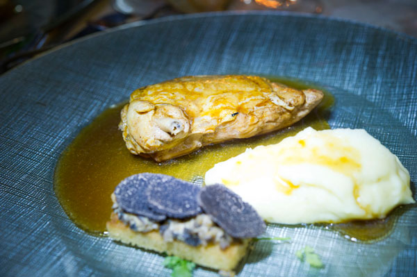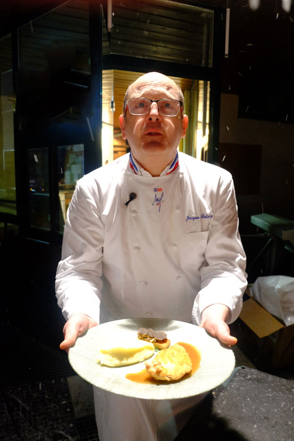 The hot dish is a Supreme of farm Guinea Fowl, roasted in its juice with Tartine of truffled Rillons and onctuous mashed Ratte. Serving a hot meal at this altitude is a true challenge!