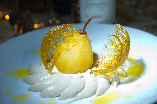 The sumptous dessert by Bruno Laffargue was a Safraned Pear on a Gianduja Macaroon and Orange Cream.