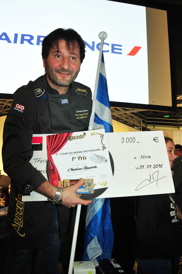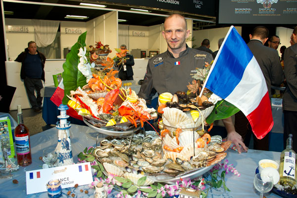 At the end of the allotted time, each candidate was able to unleash their creativity, and the true oceanic masterpieces were offered for public admiration. Christian Bouvier, representing Greece, and working for Coquillage Claude in Marseille, who ascended to the top step of the podium, followed by Francisco Pires for Portugal (L’Huitre de Paris) and Mickael Renoir, for France (Poissonnerie de Lucine à Cap Ferret).