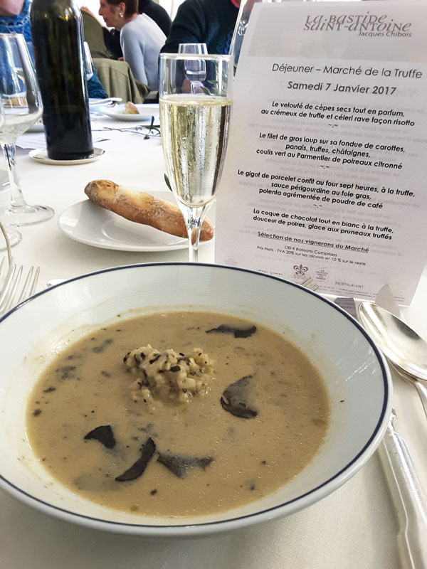 Pour sublimer les saveurs de ce somptueux repas en hommage à la Truffe Noire, le sommelier proposait sa sélection des vignerons du Marché: un vin Blanc Mouton Cadet et un Rouge Côte de Provence Saint Victorin.
