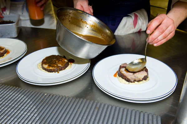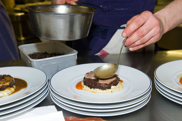 Pour le plat de viande, Jacques Chibois innove avec un original et succulent Gigot de Porcelet confit sept heures au four, à la Truffe, Sauce Périgourdine au Foie Gras, avec sa Polenta agrémentée de poudre de Café. Un festival de textures avec le confit fondant sous la langue, couronné d’une tranche de gigot d’un tendre porcelet riche d’une onctuosité à l’arrière-goût de beurre fin, posé sur un lit de polenta habillée d’une sauce au Foie Gras qui donne toute sa dimension au plat. L’habile construction de saveurs est exaltée par le puissant parfum d’humus et de terre, omniprésent, du diamant noir, adouci par la subtile touche orangée du potimarron quand le café rappelle sa note d’amertume dans la crémeuse polenta.