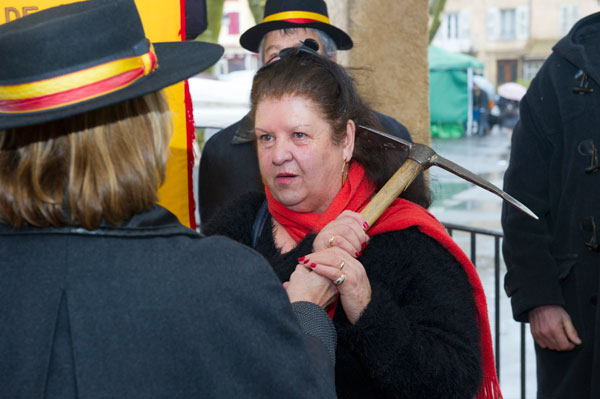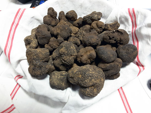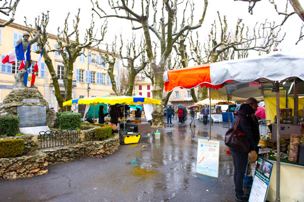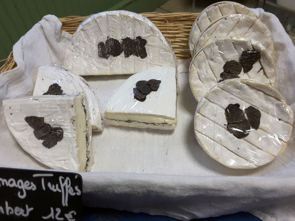 Un marché de la truffe, le 3ème de France de par son importance, se tient à Aups tous les jeudi matins, du dernier jeudi de novembre jusqu’au dernier de février. (C’est en janvier ou février que les truffes sont les meilleures). Cette année, la pluie avait poussé les négociants à se réfugier dans la salle communale. Les rabassiers, reconnaissables à leurs chasubles et chapeaux noirs et leur foulard rouge autour du cou, présentent les truffes nichées dans des paniers en osier. Le cours est fixé par les courtiers, en fonction de la qualité et de l’importance des truffes mises à la vente. Une bonne truffe est celle qui est lourde, qui sent fort, à a chair bien noire et marbrée de blanc. Un coup de canif peut permettre de vérifier la chair de la truffe. La truffe se consomme fraîche, en lamelle ou râpée, et ennoblit tous les plats, même les plus simples, ravissant les papilles de son parfum charnel.