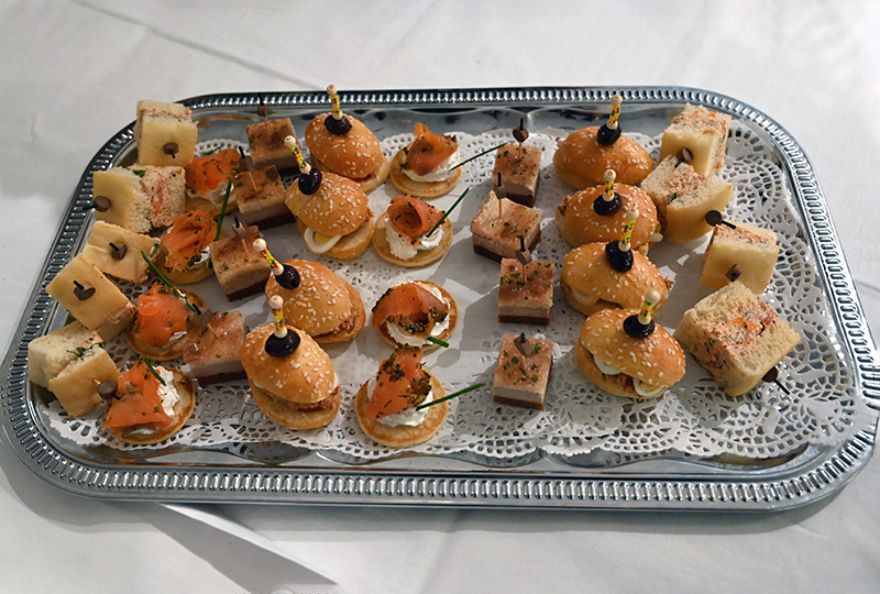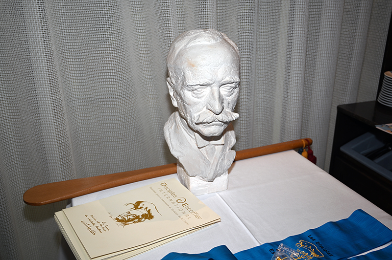 Après les intronisations et en entrée de jeu, les disciples ont pu se régaler d’un Croustillant d’Escargot de Callas, Duxelle de Champignon, crème d’ail à la chlorophylle, Blinis au Saumon, Opéra de foie gras, Navettes façon pan bagnat, Foccacia tomates confites, olives taggiasche et autres gourmandises. Le tout était accompagné des délicieux cocktails d’un apprenti barman, Disciple d’Escoffier, et des Fines bulles Champagne Comte de Cheurlin siglés Auguste Escoffier (créé en hommage à l’anniversaire des 175 ans d’Auguste Escoffier). Les Champagnes Auguste Escoffier font partie de la Gastronomie, du partage, de la dégustation, du rassemblement comme aime le vivre les Disciples Escoffier. Cerise sur le gâteau avec la mignonnette d’eau de vie de mirabelles de la Distillerie Artisanale JM Lesein en Lorraine offerte par Georges Vikiovski et les délicieux Sablés des Templiers à Biot.