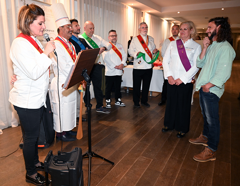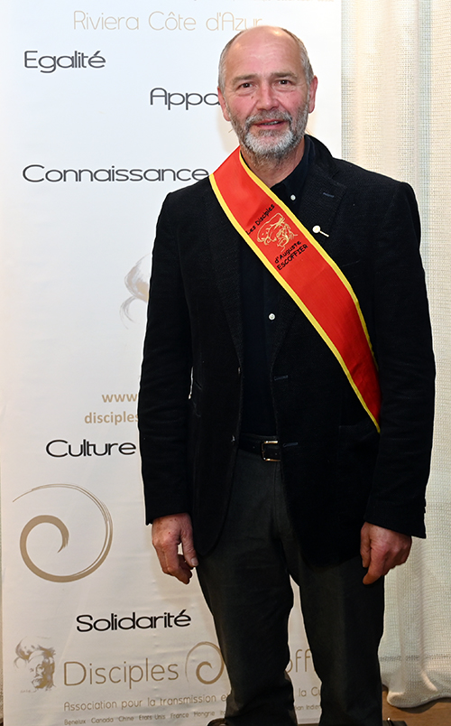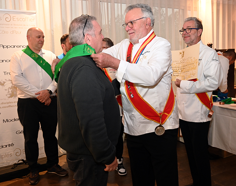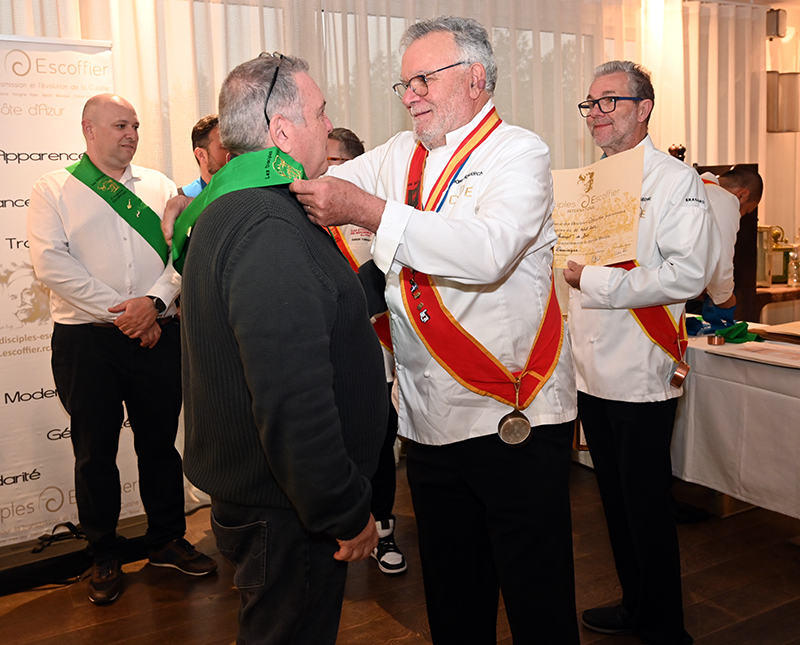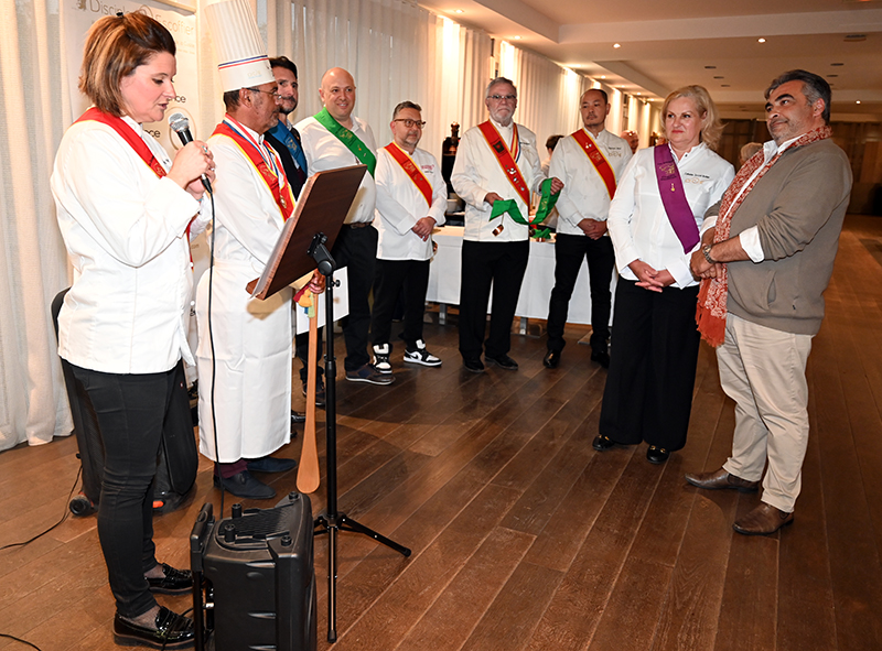 Impressionnés par le cérémonial, les impétrants se sont succédés sous la cuillère en bois du Président qui leur a transmis « l’esprit Escoffier » par trois vigoureuses et joyeuses claques de cuiller sur les épaules. Ont été ainsi adoubés: Elizabeth Houel (Épicurienne), Alexandru Cozma Gelu (Épicurien – chirurgien dentiste), Jean Baptiste Dadrier (Épicurien – ancien chef d’entreprise transaction et gestion immobilière), Dominique Flavio (Chocolatier torréfacteur – Maison Duplanteur), Thierry Moriou (Épicurien – Directeur événementiel commercial), Nicolas Montessuy (Épicurien – artisan carrossier), Laurent Raynaud (Créateur de Mimocella – temple du mimosa à Mandelieu-la-Napoule et agent immobilier pour CHR), Alexandre Weglicki – L’Espigaou (Héliciculteur en agroforesterie).