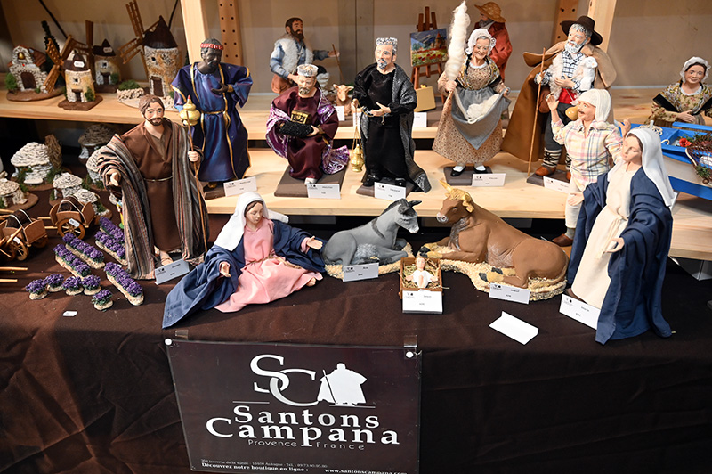Cette année, de nombreux santonniers sont venus des quatre coins de la Provence pour exposer leurs créations. Parmi eux : Marcel Carbonel, Santon de Provence Cavasse-Fery à Venelles, a créé une nouvelle collection pastel; La Maison Fouque à Aix en Provence; L’AM santonnière à Mouans-Sartoux; Lise Berger et Colette à Roquevaire; BJM, les Santons d’Art d’Alice Bertozzi; L’Atelier des Santons Stéphane Campana; Daniel Coulomb et Maryse Di Landro, Didier; Jacques Flore et les Ateliers Créatifs à Aubagne.
