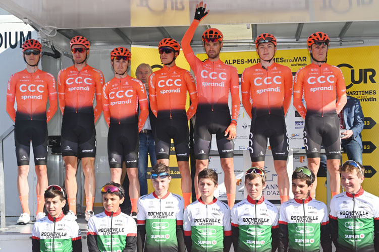 Les coureurs de chaque équipe se sont ensuite dirigés vers un immense podium pour signer la fameuse feuille des engagés et se sont présentés au public devant la haie d’honneur des Cadets et Minimes du Vélo Club rochevillois. Pour l’occasion, les jeunes licenciés étaient accompagnés par Alice Rocchi, la secrétaire générale du club et responsable départementale des écoles du cyclisme. Ces champions en herbe se sont ensuite rendus sur le départ de la course pour ouvrir la route aux coureurs. La course, principalement parrainée par le Département des Alpes-Maritimes, c’est le président du département, Charles-Ange Ginesy, accompagné de Michèle Tabarot, Député, et de nombreuses personnalités, coupa le ruban bleu, blanc, rouge. Il donna ensuite le top départ en brandissant un fanion par la fenêtre d’une voiture accompagnatrice.