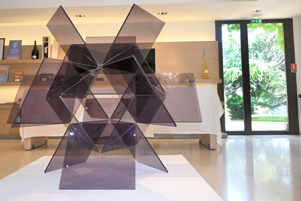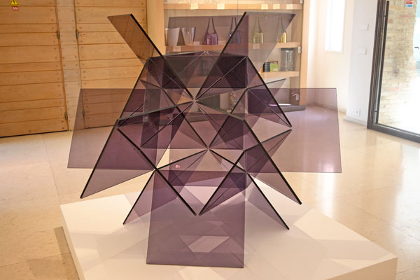 Peintre et sculpteur espagnol de l’art cinétique, Francisco Sobrino (1932, Guadalajara, Espagne – 2014, Bernay, France) emploie dès les années soixante du plexiglass transparent fumé et réalise des formes géométriques simples dont le juxtaposition donne naissance à de nouvelles formes au développement infini.
