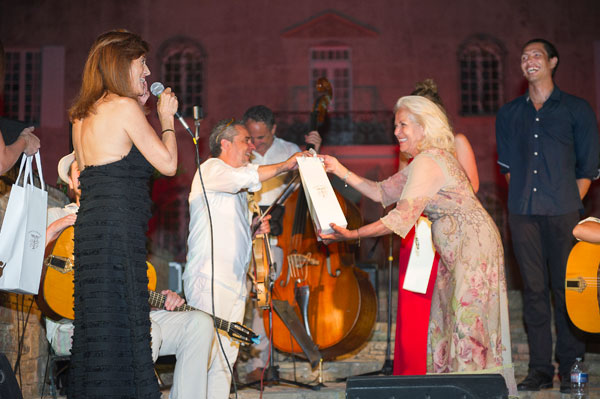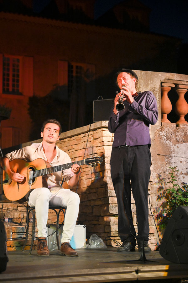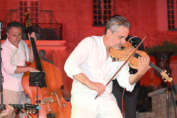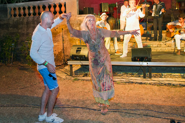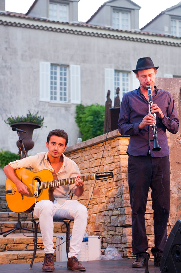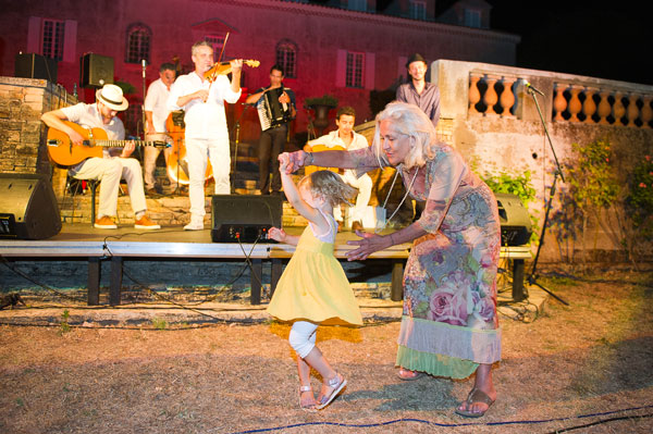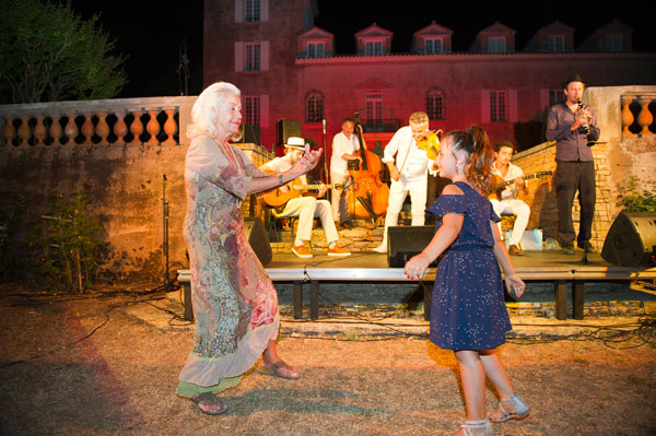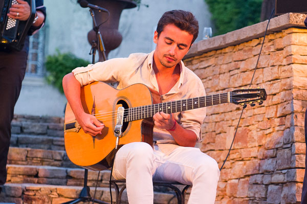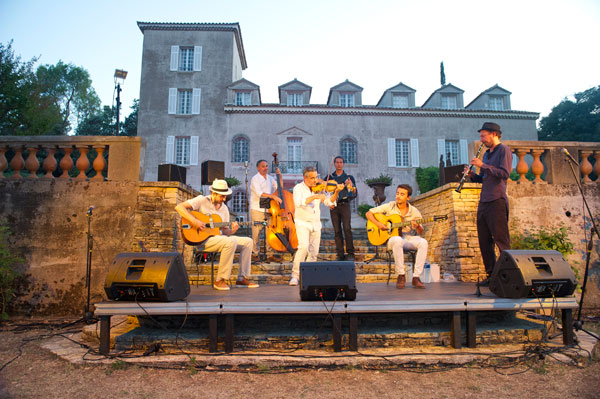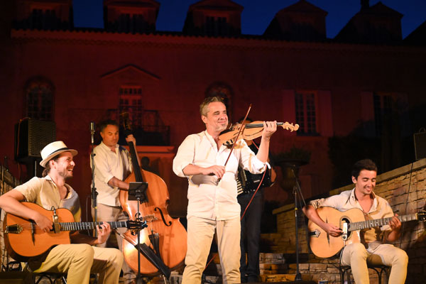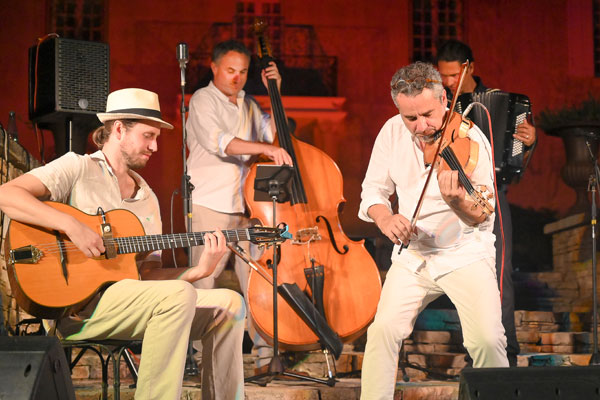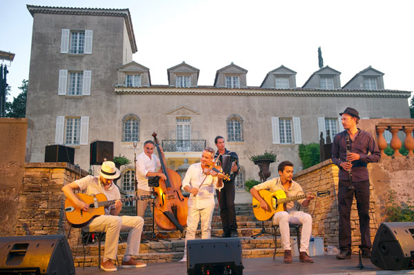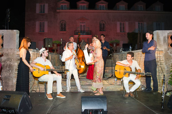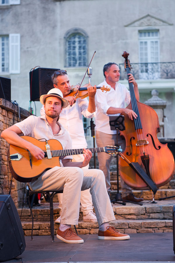 La joie de vivre a ensuite pétillé avec la musique Swing et Manouche. Le groupe Basilic Swing est composé de Benjamin Marciano (Guitare), Pierre Zeinstra (Guitare), David Bergeron (Contrebasse), et de deux solistes virtuoses: Sylvain Congès à la Clarinette et Frédéric Ladame au violon. La formation se complétait du talentueux Simon Sieger à l’Accordéon en « guest » pour le concert au Château Roubine.