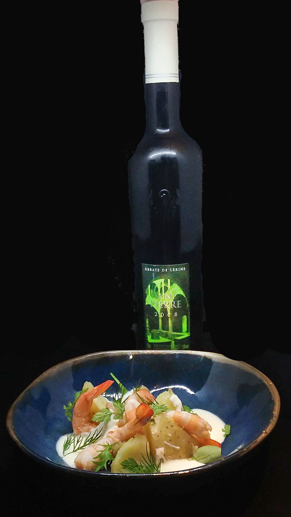 La nouvelle décoration lumineuse de la salle, à la fois moderne et élégante, reflète la cuisine du chef: goût, naturel, authenticité et raffinement. Chaises bistro, tables nappées de blanc avec serviette lie de vin et une rose. Sur les tables, coulent d’originales « lampées » de lumière depuis des bouteilles suspendues (des bouteilles de crus de l’Abbaye de Lérins, découpés par le chef lui-même!). Un coin intime, décoré en tissu, est abrité par un claustra étagé en chêne naturel peuplé de plantes. Un côté de la salle, habillé de liège naturel, répond aux miroirs du mur à l’entrée. Porte bougie en bouleau et porte serviette en liège complètent l’intervention de la Nature. Sur un pan de mur, une belle vinothèque stimule l’imagination alors qu’un grand panneau donne la recette de la Crème Brulée à l’Orange, une des délicieuses recettes à découvrir lors des ateliers de cuisine du chef.